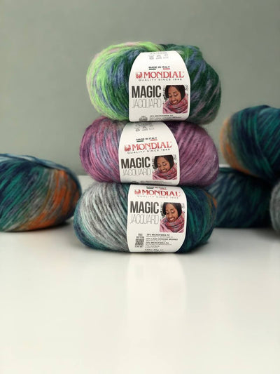 Do you like variegated yarns? We do a lot! Magic Jacquard by Mondial is a real gem - it's soft and warm and has lovely spots of different colors incorporated into gradient base. 17% Alpaca, 38% Microfiber PC, 23% Merino Virgin Wool, 22% Microfiber PA, one ball contains 125 m and weights 50g.