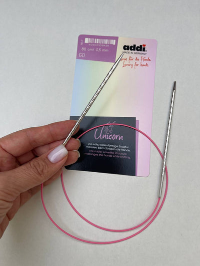 Are you a hard knitter? If you knit for hours, you might know that sometimes it can cause finger pains. If this is what you experience, try the new Addi Unicorn - it's textured needles massage your hands while you knit and help you get the most joyful experience possible.