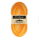 Go on an adventure with Scheepjes Arcadia! Scheepjes Arcadia is a gorgeous sock yarn, inspired by impressive landscapes from all over the world. It is a wear-resistant yarn made from 75% Superwash Virgin Wool and 25% Polyamide in both striped colourways and solid colours. The yarn is warm but still has the breathable quality of wool. It is wear-resistant and easy to care for, thanks to the polyamide component. Arcadia has great stitch definition, feels slightly rustic to the touch, but softens during use. The Scheepjes Arcadia collection offers both striped colourways and solid colours, which grants plenty of options for creating your very own knitted socks. For example, you can knit a striped sock with heel and toes in solid shades. Arcadia is of course also suitable for all sorts of clothing and accessories, such as sweaters and scarves.