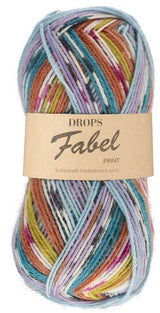 Both print and long print colours in DROPS Fabel are produced with a method called “fancy dyeing” that differs from other methods in that each dye lot has small variations in both pattern and nuance. This is no fault or defect, but part of the yarn's character.