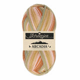 Go on an adventure with Scheepjes Arcadia! Scheepjes Arcadia is a gorgeous sock yarn, inspired by impressive landscapes from all over the world. It is a wear-resistant yarn made from 75% Superwash Virgin Wool and 25% Polyamide in both striped colourways and solid colours. The yarn is warm but still has the breathable quality of wool. It is wear-resistant and easy to care for, thanks to the polyamide component. Arcadia has great stitch definition, feels slightly rustic to the touch, but softens during use. The Scheepjes Arcadia collection offers both striped colourways and solid colours, which grants plenty of options for creating your very own knitted socks. For example, you can knit a striped sock with heel and toes in solid shades. Arcadia is of course also suitable for all sorts of clothing and accessories, such as sweaters and scarves.