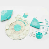 • The circular needles are supplied in a unique circular pouch that can be folded twice into a triangular shape. On the inside of the case, the needle sizes are clearly marked on the different compartments made with transparent fabric, so that the needles can be neatly stored. The accessories can be stored in the separate small triangular pouch with zipper. The teal-coloured accents and the floral motif in this set are characteristic of the KnitPro Mindful collection.
