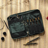 The set is supplied in a beautiful rectangular fabric pouch that closes with a zipper. The inner lining features a beautiful blue colour, while the outer section shows neutral shades and blue embroidery. The case has separate compartments for storing needle tips and plenty of other compartments for cables and accessories.