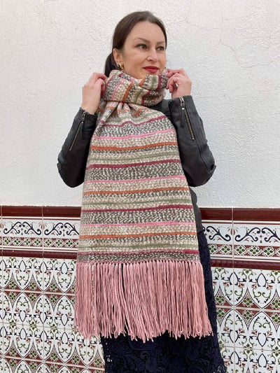 Look how pretty it turned out with zero effort of changing the colors! 140 cm length without tassels and 180 with tassels, 50 cm width - all out of just 2 balls of the fabulous Easy Jacquard yarn by Katia, which is available on Amazingwool with worldwide shipping.
